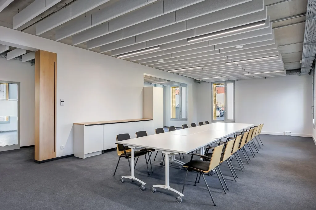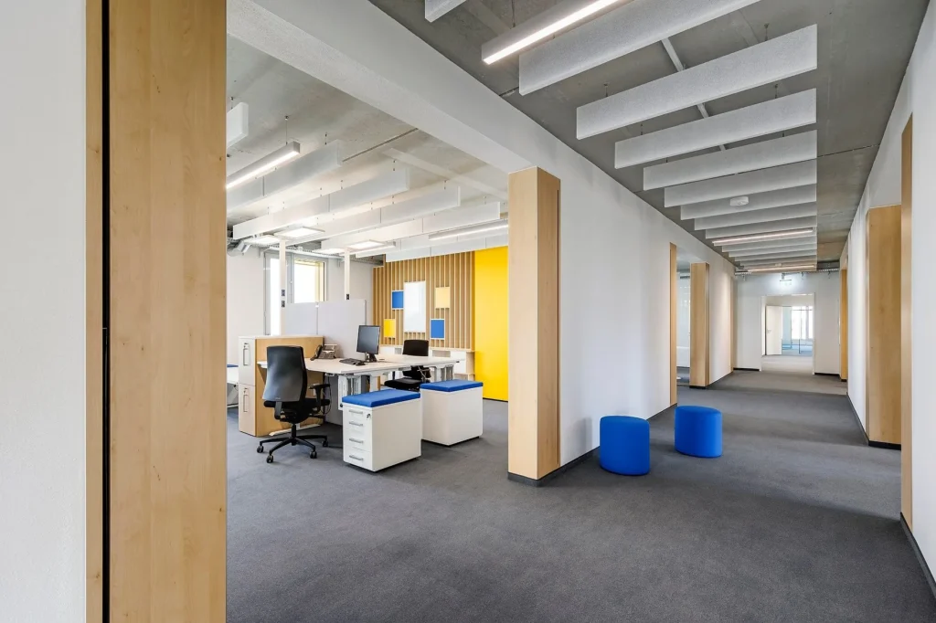 „Bei der Raumkonzeption gingen wir jedoch andere Wege,“ betont Schwarz. „Rund 70 Prozent der Fläche wird künftig an Fremdnutzer vermietet. Daher wollten wir nicht nur Großraumbüros umsetzen, sondern auch abgeschlossene Büroeinheiten ermöglichen.“ Eine wichtige Voraussetzung für das Gebäudekonzept war die Schaffung eines großen, zusammenhängenden Raumes mit freier Luftzirkulation sowie steuerbaren, motorisierten Fensterklappen, die eine ausreichende Frischluftzufuhr sicherstellen. An den mittig im Gebäude angeordneten Wandscheiben wurden zudem Überströmelemente aus Holz eingebaut, sodass trotz Abtrennung von Büroräumen eine dauerhafte Querlüftung bei gleichzeitiger Schallreduzierung möglich ist. So kann man leicht kleinere Büroeinheiten schaffen und dabei trotzdem die Luftzirkulation gewährleisten. Sollte der Bereich dann doch als Großraumbüro genutzt werden, dienen diese Elemente aus Holz automatisch als prägendes Gestaltungselement des Innenraums.