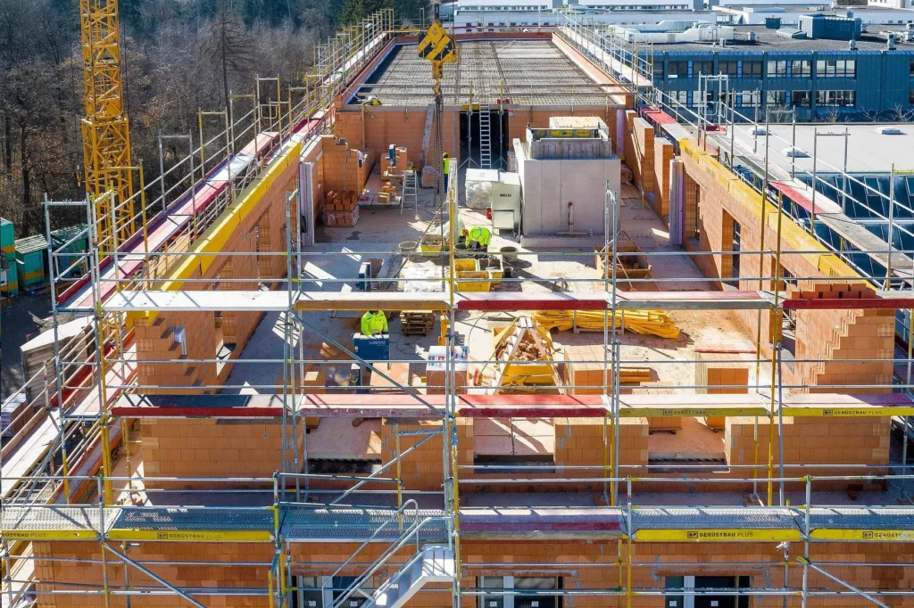 Das Rohbauteam des Generalunternehmers, der C + P Schlüsselfertiges Bauen GmbH & Co. KG (Angelburg), erstellte das Außenmauerwerk entsprechend der Zulassung Z-17.1-1114 (WS08 Coriso) beziehungsweise Z-17.1-1021 (WS10 Coriso) und den Bestimmungen der DIN EN 1996 mit deckelndem Dünnbettmörtel. Dank seiner leichten Verarbeitung erwies sich der Coriso-Mauerziegel auch bei seiner Verlegung als wirtschaftlich vorteilhafter Baustoff. Besondere Sorgfalt erforderte dabei die Ausführung der ersten Mauerwerksschicht aus Kimmsteinen, um einen Ausgleich von Deckenunebenheiten zu schaffen. Sie diente angesichts des Ziegelformates zudem der Anpassung der Außenwand an die Geschosshöhe.